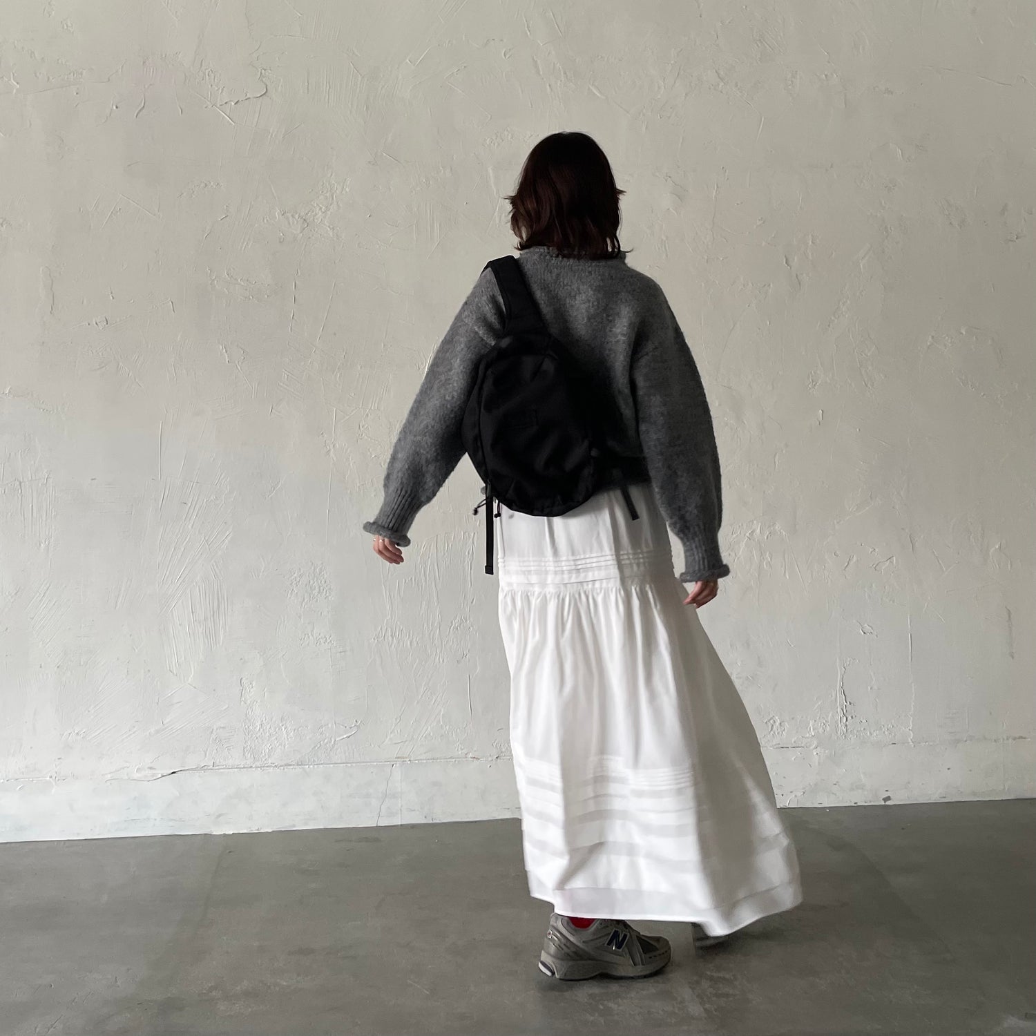 腰まわりに切り替えを入れているのでボリューム感のあるニットを合わせても重くなりすぎず、すっきりとした印象に。