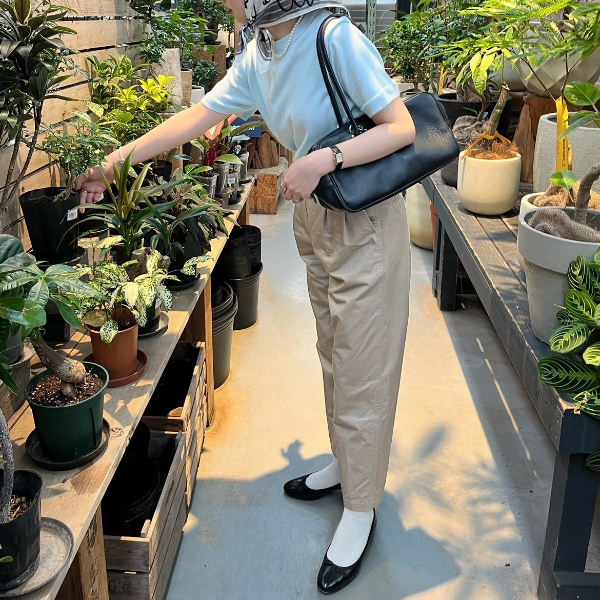 コットン100%の中肉のチノを使用しているのでオールシーズン着用いただけます。上品な光沢感や程よいハリ感がカジュアルすぎず大人の女性も着用しやすい素材感です。ベーシックなベージュとネイビーの2色展開でご用意しております。