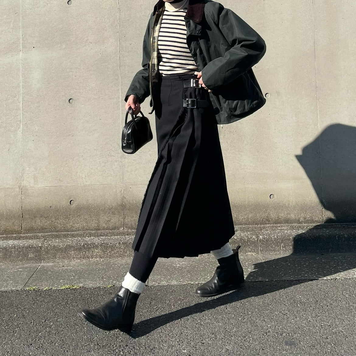存在感のあるサイドのレザーベルトがコーディネートを引き締めます。まさに1枚でコーディネイトの主役となるスカートです。