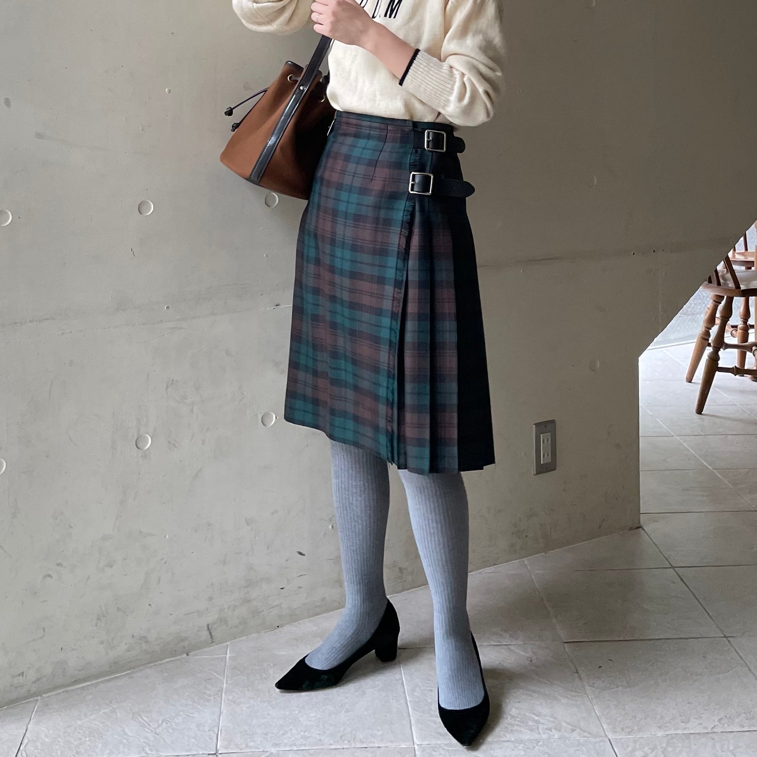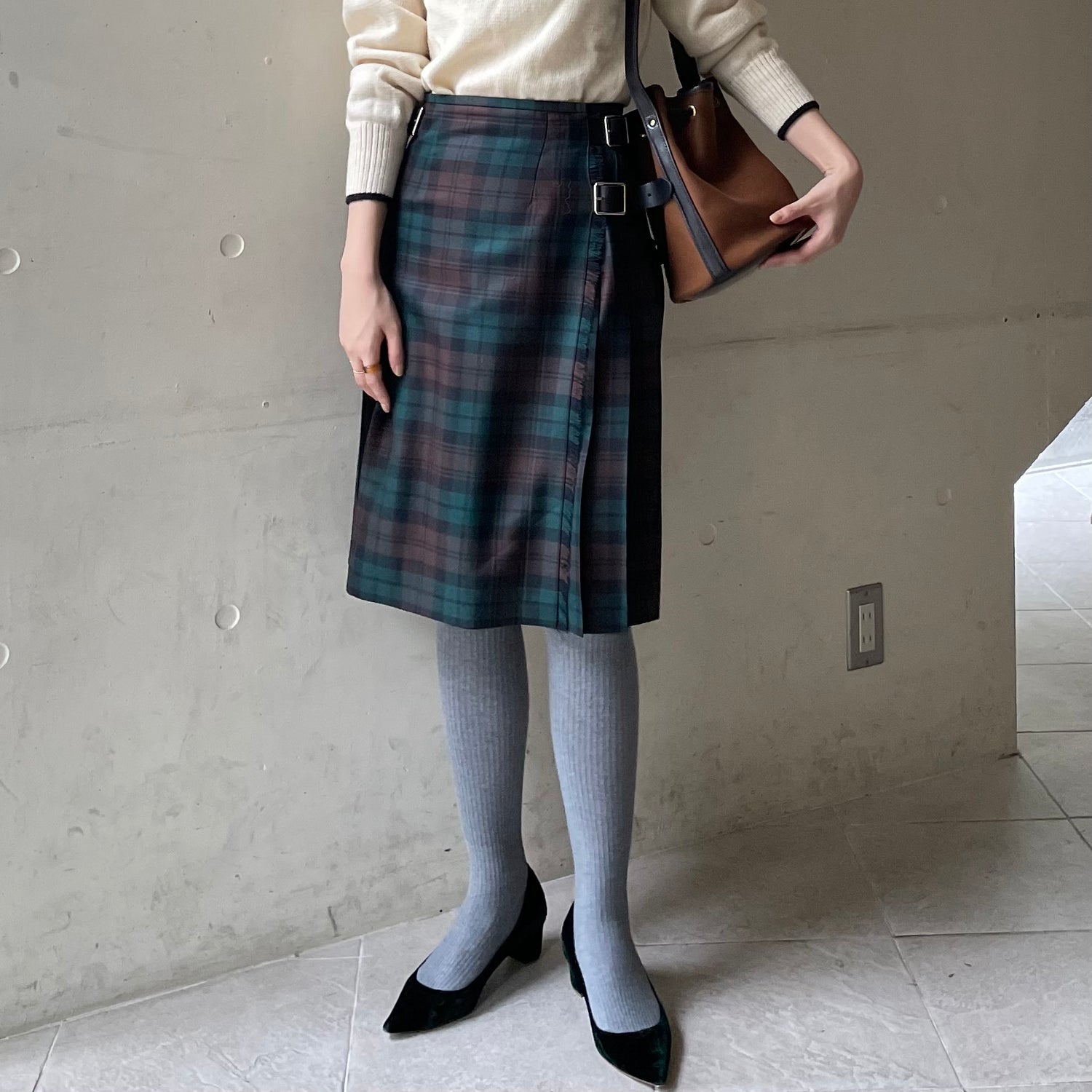 存在感のあるサイドのレザーベルトがコーディネートを引き締めます。まさに1枚でコーディネイトの主役となるスカートです。
