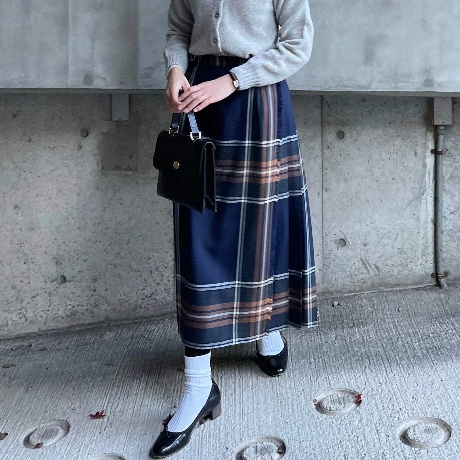 こちらのバロウのカラーは、あまり見かけないビッグタータンチェック柄。存在感はありつつもネイビーベースで落ち着いた配色なので、着回しやすいスカートです。
